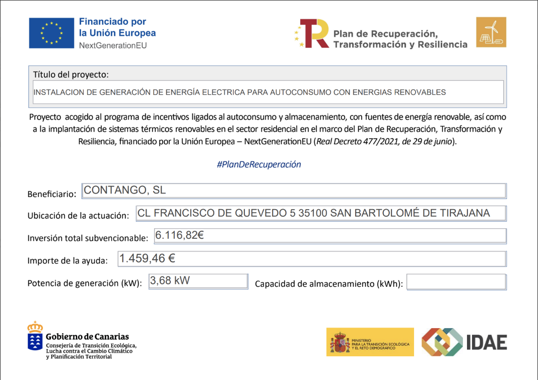 In Contango SL siamo impegnati per l’ambiente, per questo nel 2023 abbiamo installato pannelli solari fotovoltaici nelle nostre strutture, progetto aderente al programma di incentivi legati all’autoconsumo e allo stoccaggio con fonti di energia rinnovabile, finanziato dall’Unione Europea attraverso il Fondo NextGenerationEU, nell’ambito del Piano di Ripresa, Trasformazione e Resilienza, in collaborazione con il Ministero per la Transizione Ecologica e la Sfida Demografica, tramite l’IDAE.